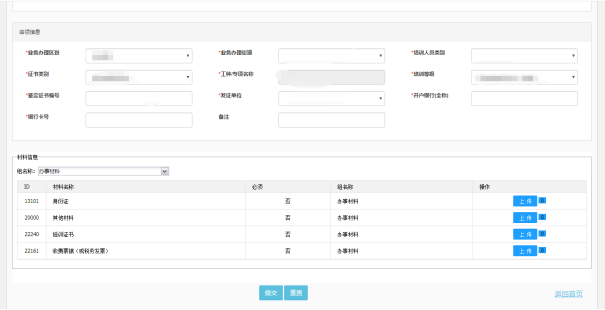 5、将个人基本信息、申领信息和材料信息完善后,点击提交向备案公共就业服务机构申领职业技能鉴定补贴,经审核无误后,按规定将补贴资金拨付到申请人本人提供的银行账户。