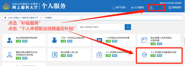 4、点击“补贴服务”,选择个人申领职业技能鉴定补贴,选择办理地。