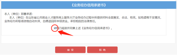 3、点击“个人登录”,阅读并同意上述《业务经办信用承诺书》,点击“接受”,进入登录界面,输入信息登录系统。(未注册用户请先注册)