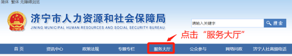 1、登录济宁市人力资源和社会保障局网站(/),点击顶部“服务大厅”。