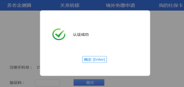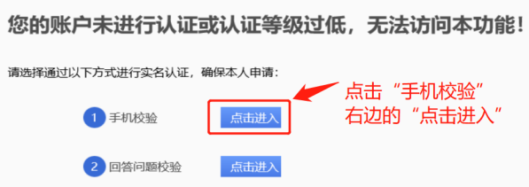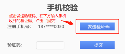 4、登录成功后,若出现以下界面,请点击手机校验右侧的“点击进入”——点击“发送验证码”——输入验证码——点击“提交”——点击“确定”,提示认证成功。