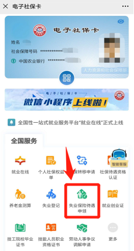 失业人员进入公众号“济宁人社”或“我的社保卡”—点击菜单栏“电子社保卡”—点击“卡面服务”—查看“全国服务”—点击“失业保险待遇申领”,依提示完成相应操作。其他如“网上申领”第4、5、6步。