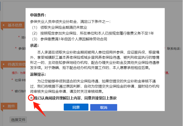 5、仔细阅读此页面提示内容(“申领条件”、“承诺”),符合申领条件点击“我已认真阅读……”前的○——点击“同意”。