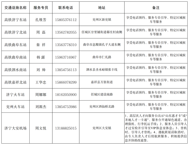 根据《济宁市高层次人才服务绿色通道实施办法》(济人社发〔2017〕42号),济宁市建立了高层次人才服务绿色通道,为高层次人才在济宁创新创业提供系列优惠政策和便利服务。为方便高层次人才享受绿色通道服务,现首批将交通、旅游、医疗、健身绿色通道服务事项承办机构清单公示如下: