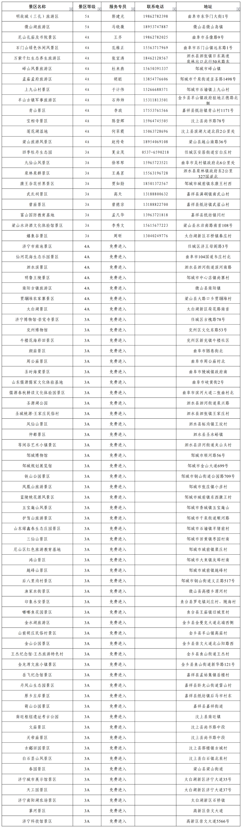 二、高层次人才免费进入3A级以上景区及森林公园名单